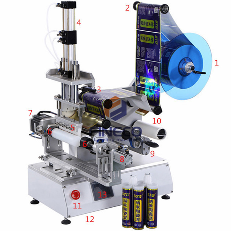 The machine will clamp the product and pull-out the label, the wheel on the top of machine will press the label onto the product and then roll until the labeling is finished.